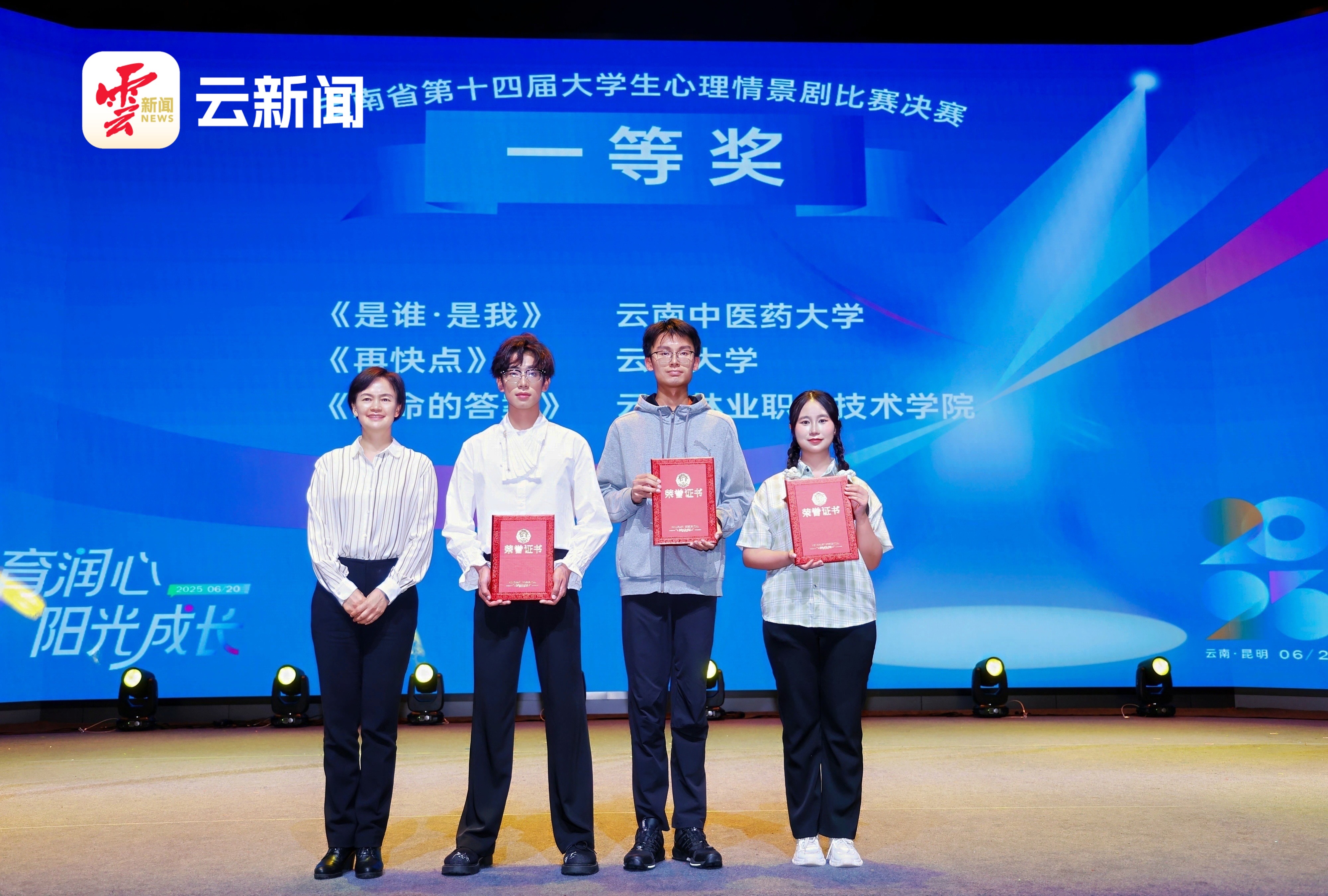 6月20日,由中共云南省委教育工委、云南省教育厅主办,云南农业大学承办,云新闻客户端协办的2025年云南省学生心理情景剧决赛圆满落幕。经过激烈角逐,我校选送的参赛作品《再快点》以独特的视角、真挚的情感和出色的演绎,在众多作品中脱颖而出,荣获高校组一等奖。