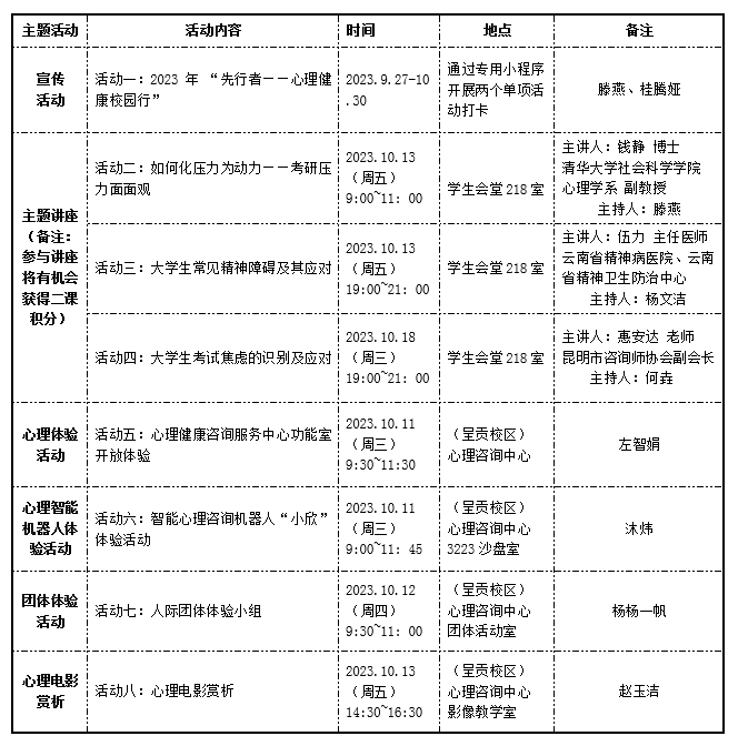 【内容与形式】在呈贡校区心理健康咨询服务中心体验心理健康咨询服务中心功能室,可在活动时间段内直接到心理咨询中心体验。