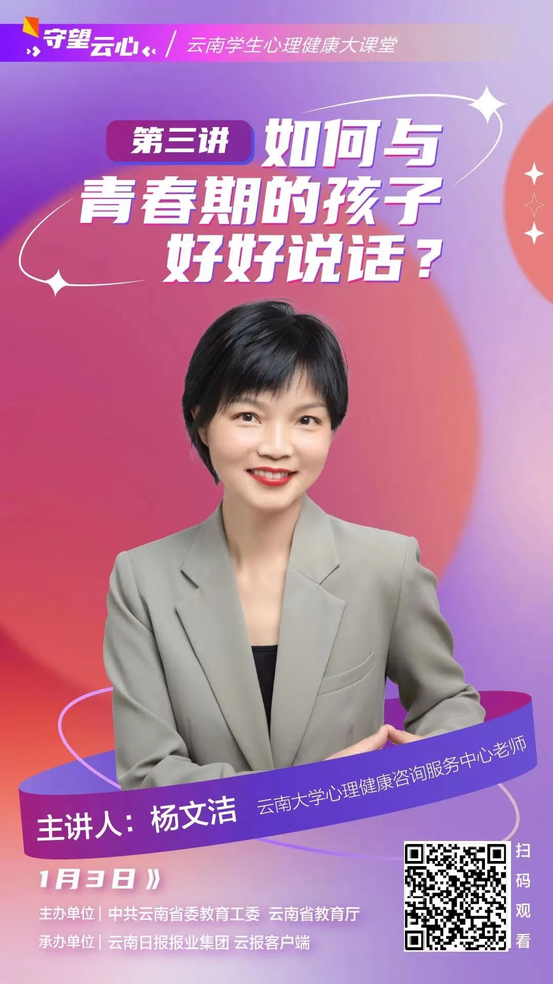 “守望云心”云南学生心理健康大课堂特邀云南大学心理健康咨询服务中心杨文洁老师为家长带来与青春期孩子的沟通秘籍——如何与青春期的孩子好好说话?