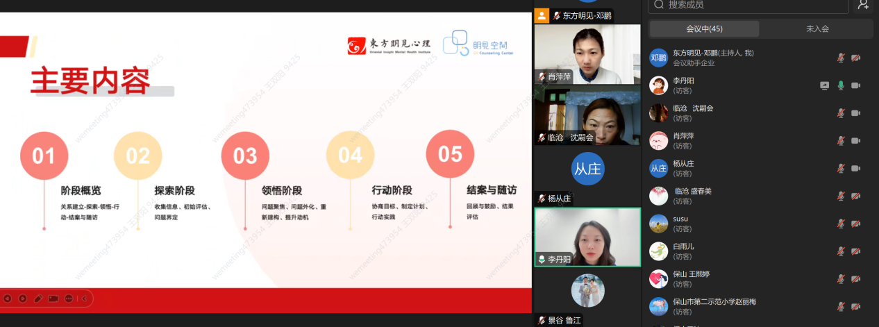 培训第一天,授课专家深入阐释了家长会商的定义,明确其核心目的在于搭建学校与家庭之间的沟通桥梁,整合双方资源与力量,共同为学生的成长与发展提供全方位的支持。同时,通过与其他常见心理服务比较,让骨干教师清晰地认识到家长会商的独特性与不可替代的价值,为后续深入学习奠定基础。