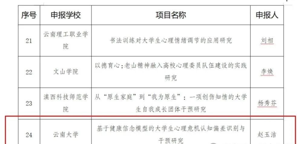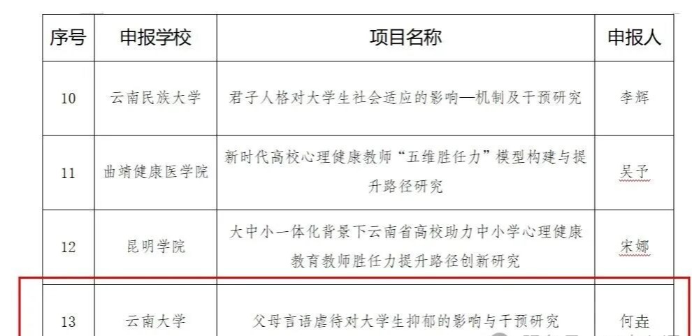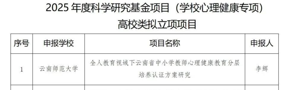 近日,云南省教育厅发布关于2025年度科学研究基金项目(学校心理健康教育专项)评选结果的公示,我校心理健康咨询服务中心组织申报的2个研究项目获批立项。根据《云南省教育厅关于开展2025年度科学研究基金项目(高校毕业生就业研究专项、学校心理健康教育专项)申报工作的通知》要求,经单位申报、材料审查、专家评审,共评选出2025年度科学研究基金项目(学校心理健康专项)高校类拟立项项目30项。