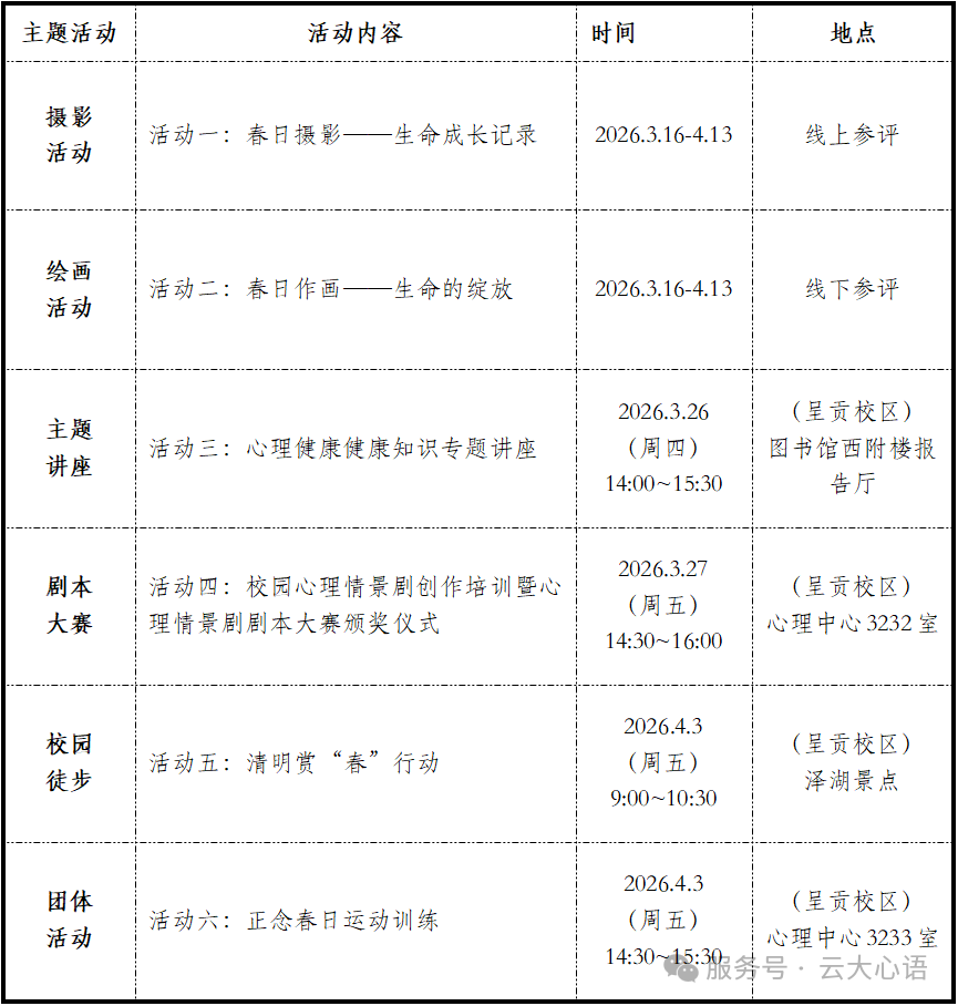 截止时间及报名途径:即日起至2026年4月13日,请将原创作品及配套文字说明,线下交于呈贡校区心理健康教育咨询中心3230室;活动结束将评选优秀作品,颁发证书。