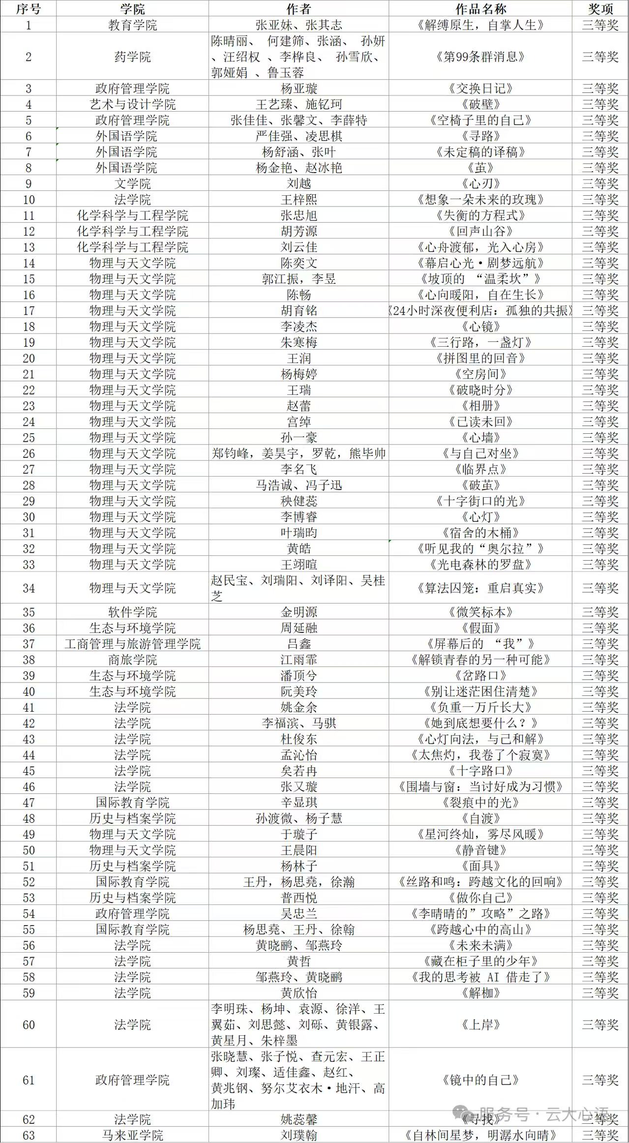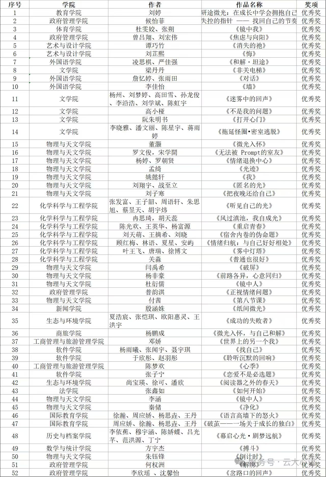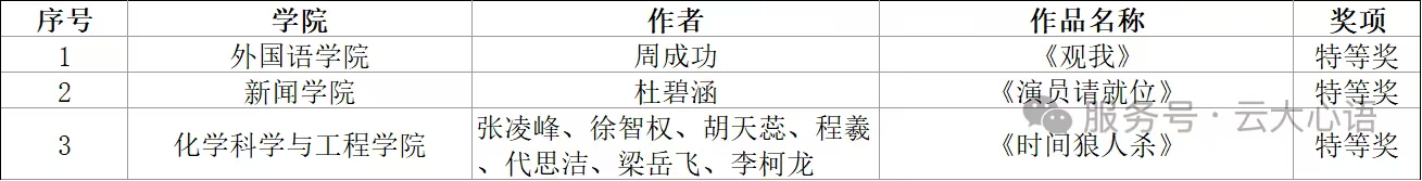 本次比赛全校同学踊跃参与,共收到投稿作品168部,经初评、查重、专家评审及综合评定,共评出特等奖作品3个,一等奖作品16个,二等奖作品34个,三等奖作品64个,优秀奖作品52个,优秀指导教师46人。特此公告,名单如下: